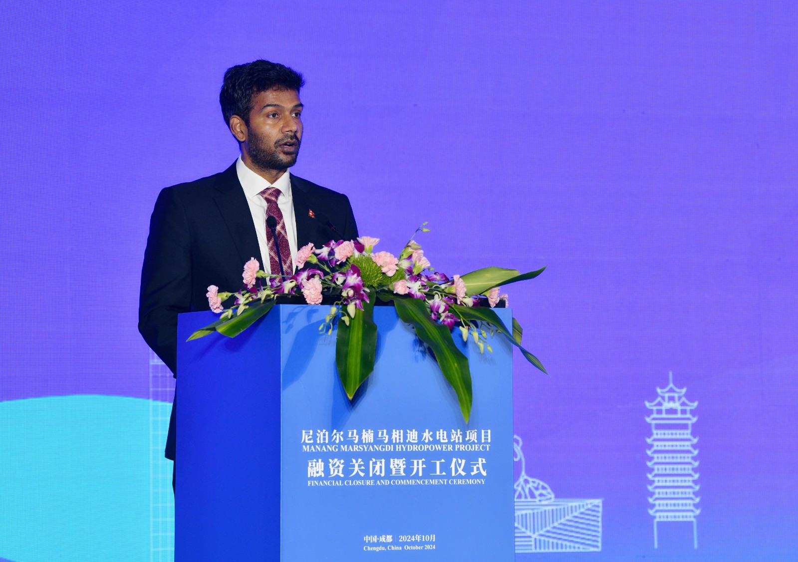 2024年10月22日,尼泊爾馬楠馬相迪水電站項(xiàng)目融資關(guān)閉暨開工儀式在四川成都和尼泊爾馬相迪河畔同步連線舉行。四川省人大常委會(huì)黨組成員、副主任宋朝華,尼泊爾駐華大使館臨時(shí)代辦蘇倫德拉·庫(kù)瑪·亞達(dá)波,川投集團(tuán)黨委書記、董事長(zhǎng)吳曉曦,中共四川省委外事工作委員會(huì)辦公室一級(jí)巡視員何光先,四川省政府國(guó)有資產(chǎn)監(jiān)督管理委員會(huì)黨委委員、副主任何政,四川省發(fā)展和改革委員會(huì)二級(jí)巡視員黃斌,中國(guó)進(jìn)出口銀行四川省分行黨委書記、行長(zhǎng)陳盛榮,中國(guó)電力建設(shè)集團(tuán)有限公司黨委常委、副總經(jīng)理王小軍,中國(guó)出口信用保險(xiǎn)公司四川分公司黨委書記、總經(jīng)理張秦等出席活動(dòng),共同見證這一重要時(shí)刻。