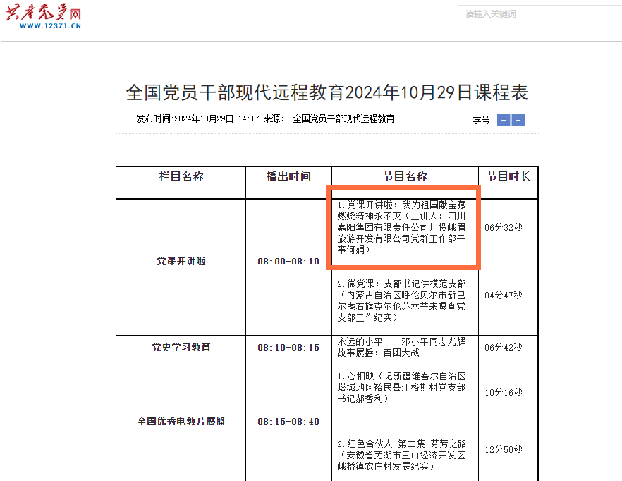 10月29日,由中共中央組織部主管、中央組織部黨員教育中心主辦的共產(chǎn)黨員網(wǎng)公布全國黨員干部現(xiàn)代遠(yuǎn)程教育課程表,嘉陽集團(tuán)微黨課《我為祖國獻(xiàn)寶藏 燃燒精神永不滅》精彩亮相,用6分32秒的時(shí)長為全國的黨員們呈現(xiàn)了難忘的一課。