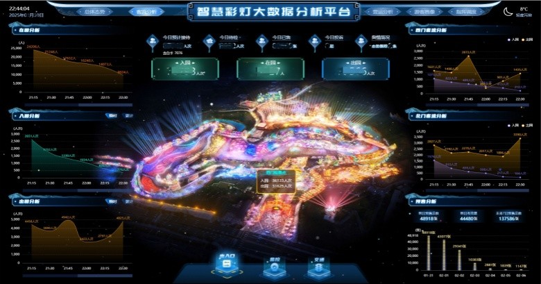 在自貢燈會的智慧化建設(shè)中,大數(shù)據(jù)分析系統(tǒng)扮演了至關(guān)重要的角色。通過數(shù)據(jù)中心所收集的數(shù)據(jù),景區(qū)管理人員可快速了解園區(qū)內(nèi)實時入園、出園、在園數(shù)據(jù)以及快速實現(xiàn)接待分析、售票數(shù)據(jù)分析、客源地分析、瞬時客流分析等功能。這些數(shù)據(jù)不僅為景區(qū)的日常運營提供了有力支持,還為未來的市場拓展和運營決策提供了有力數(shù)據(jù)支撐。