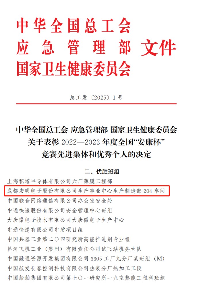 【川投信產(chǎn)】喜報(bào)!宏明電子204車間榮獲2022-2023年度全國(guó)“安康杯”競(jìng)賽先進(jìn)集體(優(yōu)勝班組)稱號(hào)!