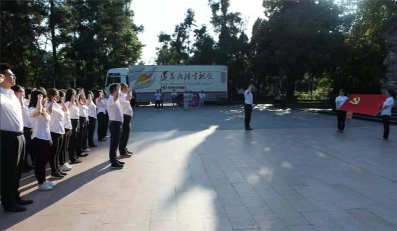 在紅軍山烈士陵園“紅軍烈士永垂不朽”紀(jì)念碑前,全體人員向紅軍烈士敬獻(xiàn)花籃、鞠躬致敬,表達(dá)對革命先烈的崇敬緬懷之情。由公司紀(jì)委書記冉蘭平領(lǐng)誓,面對黨旗重溫入黨誓詞,鏗鏘有力的莊嚴(yán)誓言激蕩在每個(gè)黨員心中。
